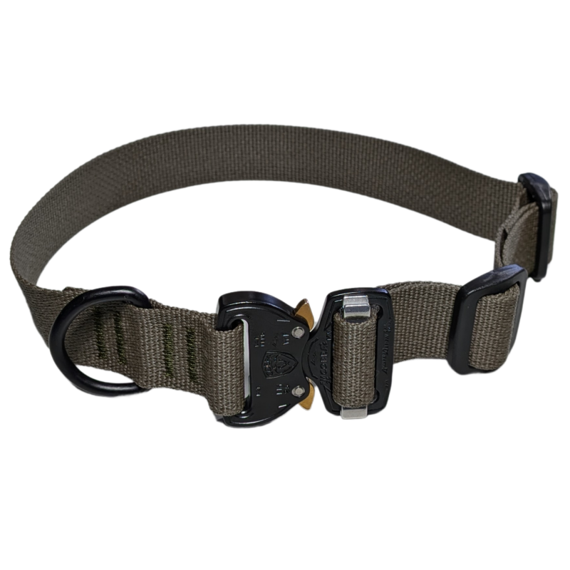 Hank's Surplus one inch mini nylon dog collar with AustriAlpin FM quick release Cobra buckle. For small to medium dogs. Super strong quick release AustriAlpin COBRA 1" buckle. Soft and flexible 1" wide nylon webbing. Heavy duty metal D-Ring attachment point. Reinforced stitching. Double webbing sliders (use to secure free end.) Weight is approx 2 oz.